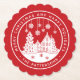 Merry Christmas Happy Holidays Winter Personalised Name Paper Coasters features the text "Merry Christmas and Happy Holidays" in modern white script on a red background and personalised with your name surrounding a home with Christmas trees and snowflakes. Perfect for Christmas and holiday parties. Designed by ©Evco Studio www.zazzle.com/store/evcostudio