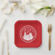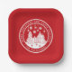 Merry Christmas Happy Holidays Winter Personalised Name Paper Party Plates features the text "Merry Christmas and Happy Holidays" in modern white script on a red background and personalised with your name surrounding a home with Christmas trees and snowflakes. Perfect for Christmas party favours and Holiday gifts or in the office for products or mail. Designed by ©Evco Studio www.zazzle.com/store/evcostudio