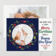 This beautiful blue botanical holiday card features a pretty circle wreath of leaves and flowers in red and green for a festive look. These bright and cheerful Christmas cards say We Wish You a Merry Christmas and a Happy New Year in chic typography. Customize with a family photo and your custom text in cute colors.