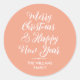 A modern Merry Christmas Happy New Year sticker or envelope seal with white elegant script calligraphy and simple stylish typography on a pumpkin pink background. Exclusively designed for you by Happy Dolphin Studio!