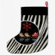 Large Christmas Stocking (Personalised) - Merry Christmas and Happy New Year! XMAS Large Christmas Stocking decorated with Christmas magic symbols, Christmas ornaments, Winter Holiday gifts elements pattern, Santa, christmas tree, christmas ball, reindeer, snowflakes, christmas stars, and more festive characters. Zebra stripes trendy pattern. Original Modern Stylish graphic design. Home, Home Décor, Christmas Décor, Stockings Gifts Presents Winter Holiday Decoration. Large Christmas Stocking Design with text template. Personalise them by adding name. Two sides graphic decoration.