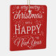 This ornament features a chalkboard style typography graphic which says "a very merry Christmas and a happy New Year!" On the back, you can put an image and last name along with the year.