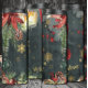 A luxurious and festive Christmas holiday design featuring a dark green forest winter's night with shimmery golden snowflakes and watercolor-painted poinsettias, pine cones and red berries under the light of a warmly lit lantern with a shiny red ball ornament on ribbon falling in mid-air. A beautiful gold brushstroke calligraphy for written greetings in French, Spanish and English. The greetings "Feliz Navidad, Joyeux Noel, Happy Holidays," can be used in place of Merry Christmas and they can be accessed in the Design Panel when you click Personalise.