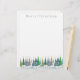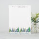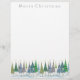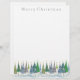 A festive letterhead decorated with a grove of Christmas trees in shades of blue and green watercolor drawn in black pen and ink with different geometric patterns. You can change or omit the wording to fit your needs.