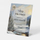 Stylish business tabletop sign template featuring a winter landscape with Christmas tree and logo. Great for a Christmas celebration or company Open House for the Holidays.