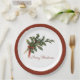 Paper plates with a vintage Christmas image of holly and turtle doves.