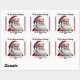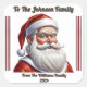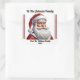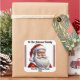 A festive square sticker adorns a beautifully wrapped gift, showcasing a jolly Santa Claus. The warm holiday colours create a cheerful vibe, perfect for spreading joy.