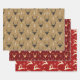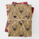 Merry Christmas holiday wrapping paper sheets featuring jumping reindeer, snow and reindeer head in brown and red background for your Christmas gift wrapping.