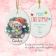 On the front of this cute keepsake ceramic ornament for a child is an adorable little koala bear wearing a Santa hat. He holds a Holiday tree decoration, and is surrounded by soft evergreen. Your child's name is at the bottom. The back of the ornament has a Merry Christmas message and your signature. Perfect for a daughter, son, granddaughter or grandson.