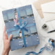 Merry Christmas Lighthouse Family Wrapping Paper. This sweet holiday design features Portland Breakwater Lighthouse with a Christmas Wreath and a dusting of snow. Personalise to add a nautical touch to your holiday gifts.