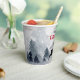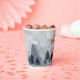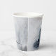 Paper cups with a watercolor image featuring a black silhouette reindeer standing among some pine trees. Grey black and white neutral colour scheme.