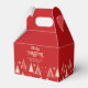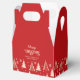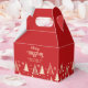 Merry Christmas red background with beige stylised Christmas trees and snowflakes midcentury retro style template favour gift box