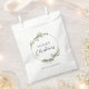 Favour bags featuring a minimalist watercolor wreath with red floral and green foliage accents. This elegant wreath frames the greeting "Merry Christmas". Easy to personalise with your family name.