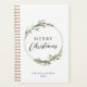 A Christmas planner featuring a minimalist watercolor wreath with red floral and green foliage accents. This elegant wreath frames the greeting "Merry Christmas". Easy to personalise with your family name.