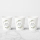 Paper cups featuring a minimalist watercolor wreath with red floral and green foliage accents. This elegant wreath frames the greeting "Merry Christmas".