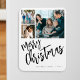 Modern stylish Merry Christmas black and white handwritten calligraphy script 3 family photos simple white holiday keepsake festive magnet with your custom personalised text.