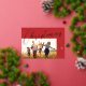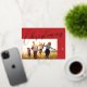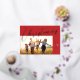 This chic custom "Merry Christmas" holiday card features a unique layout and minimalistic design with a landscape photo and modern and elegant script typography in real gold foil with a scarlet red background (can be modified). Personalize the simple last name or family signature and the year, and choose to include an additional message on the back of the card. Two additional photo spaces are also included on the back.