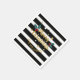 Trendy modern gold glitter modern font -Merry Christmas-text design over black and white stripes pattern Black gold and white starw with red and green evergreens accents. Customisable family name.