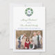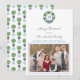 ** Photo credit: Photography © Storytree Studios, Stanford, CA ** Preppy Happy Holidays photo card design featuring a green boxwood wreath decorated with blue and white ornaments. In the centre of the wreath is space for a single letter monogram. The reverse side features a pattern made up of boxwood topiary in a ginger jar planter. If preferred, you can easily add your photo on the reverse instead (follow the instructions in the "personalise this template" area.