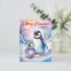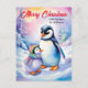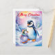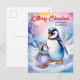 Christmas holiday postcard featuring cute watercolor penguins in a winter landscape, with customisable "Merry Christmas" greeting. Customisable message on back.