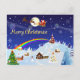 Beautiful snowscapes with Christmas trees, houses, a snow man, a church, and a rainbow with falling snowflakes. Santa Claus flying over a full moon on Christmas night.