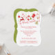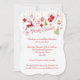 This affordable bracket shaped Christmas open house invitation has a white background with assorted dangling festive items such as a present, Christmas tree, decorations, candy cane, stocking, snowflakes, and reindeer in red and green tones with the words Merry Christmas in red.