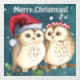 This design features two cute owls (one is wearing a Santa hat) on a tree branch on a dark blue snowy background with an inscription inside.