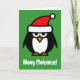 Merry Christmas penguin cartoon greeting card. Funny penguin illustration with Santa Claus hat.