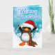 Merry Christmas Penguin Greeting Card features a decorative turquoise background with snow and snowflakes, a Happy Penguin holding a colourful candy cane wearing a Santa hat. Decorative blue and white text is Merry Christmas Inside card : features a decorative turquoise background with snow and snowflakes. Customisable text is Wishing You a Christmas filled with love. Customisable on the outside and in, this Merry Christmas Penguin personalised card comes conveniently with an envelope. Also available on Note Card size.