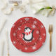 Merry Christmas Penguin Holiday Party Paper Plates with red background and white snowflakes