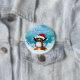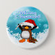 Merry Christmas Penguin Round Button features a decorative turquoise background with snow and snowflakes, a Happy Penquin holding a colourful candy cane wearing a Santa hat. Decorative blue and white text is Merry Christmas. Perfect gift for Christmas stocking stuffer.