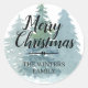 A simple, modern black and white Merry Christmas gift sticker or envelope seal with the text Merry Christmas in black chic handwritten script calligraphy on a watercolor snowy pine tree background. Simply add your family name. Exclusively designed for you by Happy Dolphin Studio. If you need any help or matching products, please contact us at happydolphinstudio@outlook.com.
