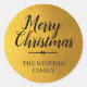 A simple and modern gold Merry Christmas gift sticker or envelope seal you can personalise with your family name or names. The text "Merry Christmas" in black is set in chic handwritten script calligraphy. Exclusively designed for you by Happy Dolphin Studio. If you need any help or matching products, please contact us at happydolphinstudio@outlook.com.