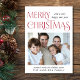 Modern holiday photo greeting card featuring "Merry Christmas" written in stylised vintage red typography, "happy new year" and a seasonal greeting in elegant red typography, your photo and your name.