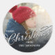 Merry Christmas Photo Silver Calligraphy Script Classic Round Sticker
