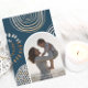 This beautiful Christmas card features a vibrant blue print with circular geometric shapes and a modern arch shaped photo. The back features an editable personal message on a white background.