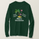 A women's long sleeved shirt with the text: merry Christmas, Happy Holidays, and Seasons Greetings. All written in white for a dark clothered shirt. Designed with a whimsical drawing of a pink flamingo wearing a red santa hat. Standing on a mound of yellow beach sand with a green and brown coconut palm tree in the back. Cute and fun festive tropical design.