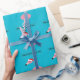 A pink flamingo wearing a santa hat on this wrapping paper that you can customise and personalise, stand above the words Merry Christmas in between red and green lines against a blue background. Text can be customised to fit your needs.