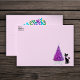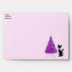 This envelope is light pink with the text Merry Christmas is colourful festive letters on back flap and a dark pink and shiny silver Christmas tree on white star rug beside a black cat with pink bow on the front. Customise your return address on the front with the template.