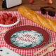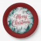 A Christmas paper plate featuring "Merry Christmas" written in scarlet with a silver and turquoise forest background.