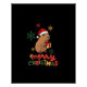 This festive illustration features an adorable capybara, wearing a Santa hat and holding a small gift, with colorful snowflakes surrounding it. At the bottom, a cheerful "MERRY CHRISTMAS" greeting is displayed in decorative lettering, creating a lovable holiday-themed design against a contrasting black background.