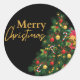 This vibrant Christmas-themed design features a lush, beautifully decorated Christmas tree adorned with colourful ornaments, baubles, candy canes, and festive gifts. The tree sits in front of a bold black circular background, which makes the rich green needles and bright decorations truly pop. To the left of the tree, elegant golden lettering spells out "Merry Christmas" in a stylish mix of fonts, adding a cheerful and warm holiday message. The overall design is festive and eye-catching, perfect for greeting cards, invitations, stickers, or digital holiday wishes.