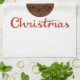 'Merry Christmas' in faux gold colour and red script with illustration of a Christmas pudding with holly centre.