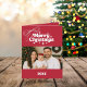 A red gradient background, white text, a red hand-drawn bow. Text and photo on the front. Merry Christmas is written with a retro style font.