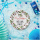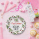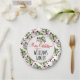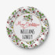 This festive Christmas paper plate showcases the text “Merry Christmas” in cursive script and your family name on a circle with red and green outline in front of a holly berry pattern.