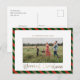 Christmas Holiday Postcard with photo, red, green and gold stripes frame and "Merriest Christmas" gold script lettering on the front.