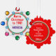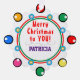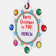 Merry Christmas to You is written in snowcapped white red typography against white background. Insert NAME written in Purple lettering (click to Edit to change font background colour). Backside is solid red colour with Love written in white curved typography. Insert NAMES and YEAR. Look of festive snowflake colourful lights ornaments in red, green, blue, orange, yellow, pink on outside border. Inside double rings in festive green and red with smaller geometric circles in silver and gold outlined in sky blue. Original Artwork Design by TamiraZDesigns.