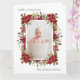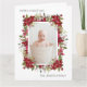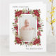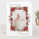 Modern and elegant "Merry Christmas" folded greeting card. The front of this beautiful card has red Christmas poinsettias and greenery on a white background, and is personalized with your favorite photo. Text, which says, "Merry Christmas" and includes your family name is completely customizable. The inside of this card is red and white and has a custom message and your name. Contact us for help with your customizations or to request matching or coordinating products.