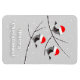 This Merry Christmas Magnet features illustration of three cute birds sitting on the tree branches covered by snow. The birds wear red Santa hats and enjoy gentle snowfall. Illustration is done in restricted grey tones to emphasize the joy of bright red colour of the hats. Great holiday gift for friends and family.