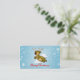 A cute cartoon image of an adorable christmas reindeer flying up in the sky with snowflakes and clouds in the background. Merry Christmas business card design.